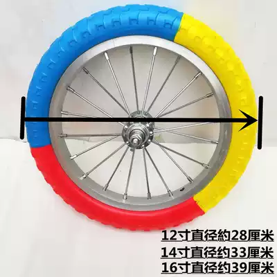 A tire is photographed. Note size 12 inch front wheel set 12 inch rear wheel set 14 inch front wheel set 14 inch rear wheel set rear wheel set flywheel remark size rear wheel set flywheel rear brake