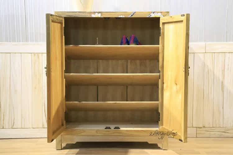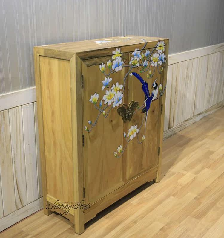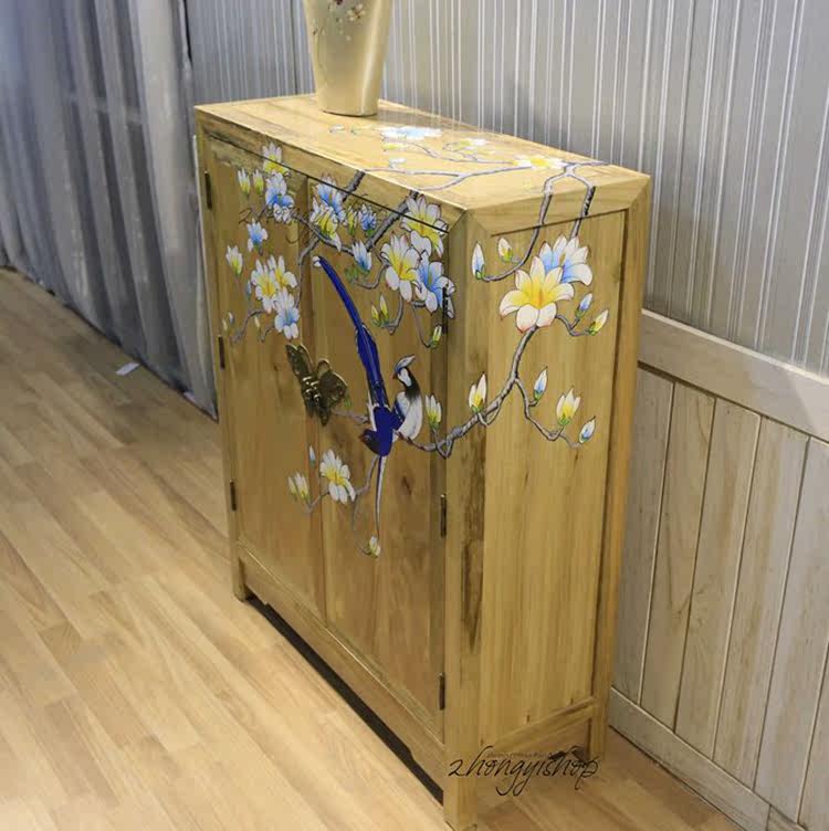 Modern new Chinese hand-painted camphor wood furniture double-door cabinet shoe cabinet porch cabinet storage cabinet hand-painted magnolia flower
