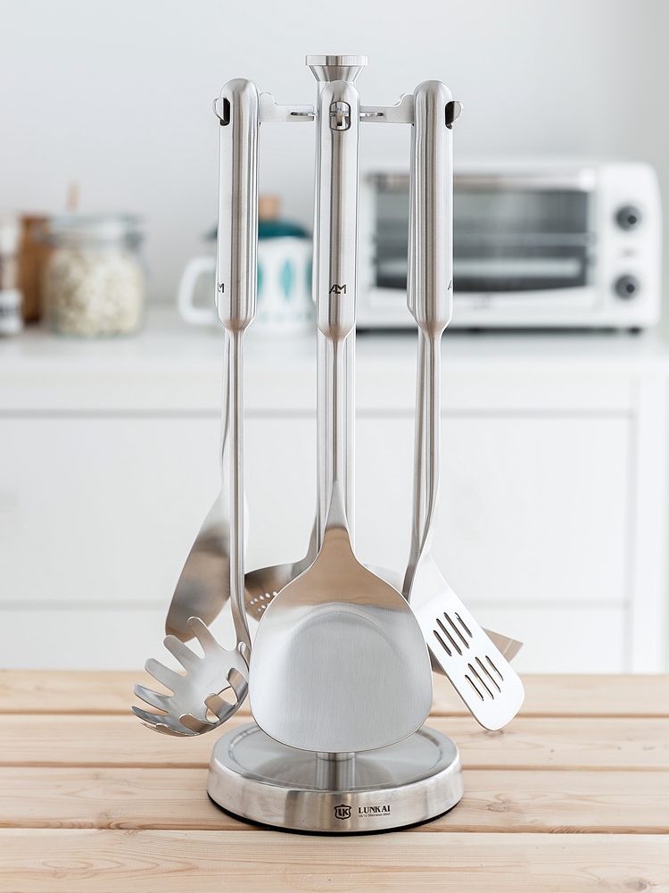 Germany 18 10 stainless steel round handle full set cooking spoon shovel 7 pieces spatula soup spoon colander frying shovel kitchen set