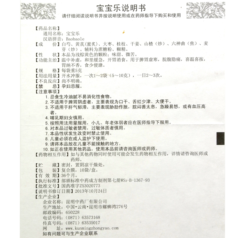 Kunzhong Baobaol 5g * 10 bags of spleen and stomach, cold, abdominal pain, less food, loose stools