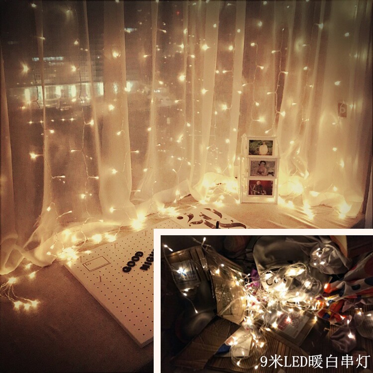 3 meters 20 stars(will flash)send battery warm white 9 meters LED light (plug-in) Blue 9 meters LED light(plug-in) color 9 meters LED light (plug-in)Green 9 meters LED