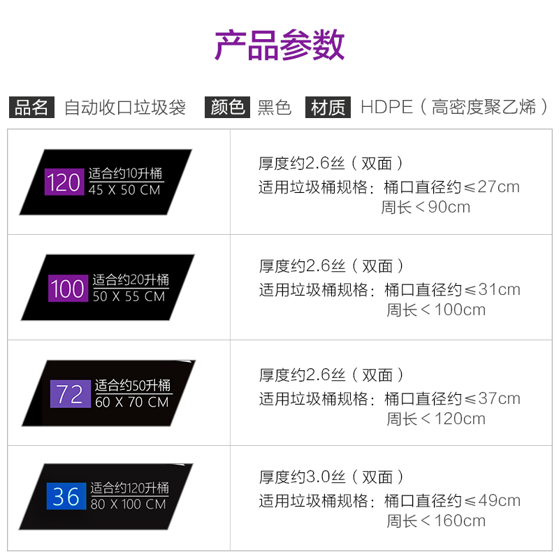 1 pack of 5 rolls 45X50cm Black automatic closure 120pcs 1 pack of 5 rolls 50X55cm Black automatic closure 100pcs 1 pack of 4 rolls 60X70cm Black automatic closure 7