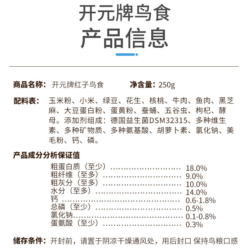 Kaiyuan brand red seed bird food feed pasta embroidered eyes acacia big tits shellfish bird food recently produced 250 grams