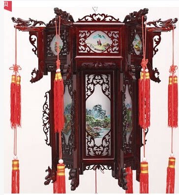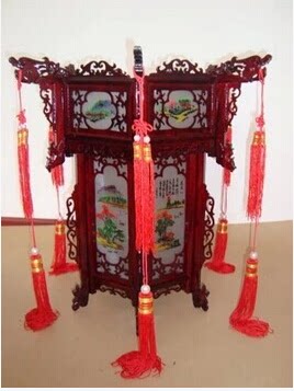 Chinese landscape painting Antique imitation sheepskin wooden palace lamp Wood carving Teahouse Hexagonal palace lamp Red lantern