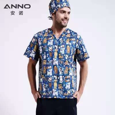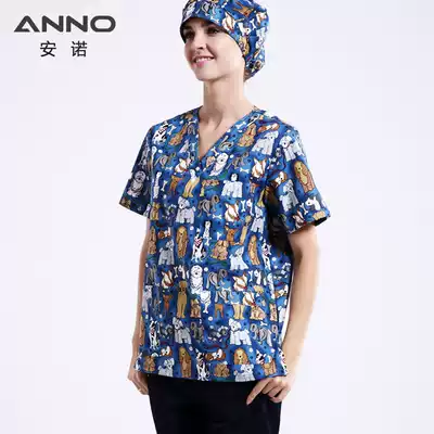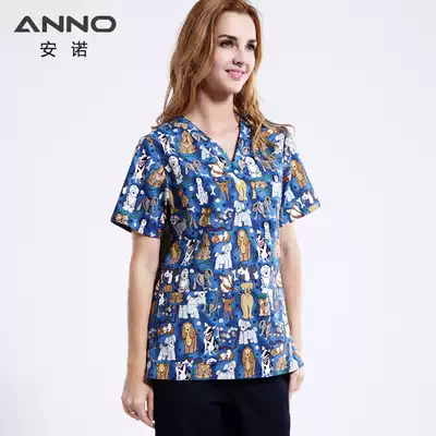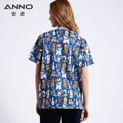 Anno surgical gown printed V-collar pet doctor wash clothes brush hand clothes beauty hospital overalls flower dog Blue