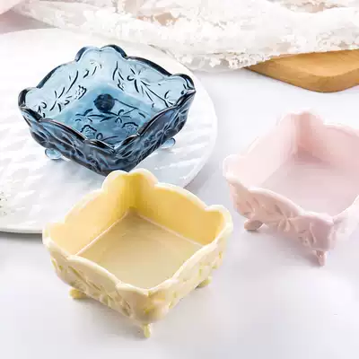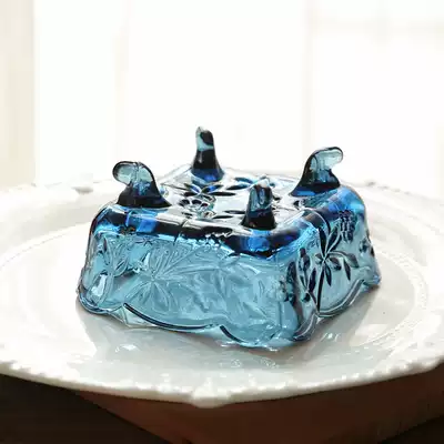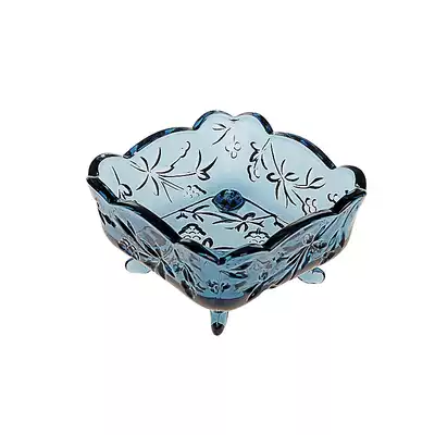 Retro blue carved grape glass square bowl Jewelry storage dried fruit bowl Ice cream bowl fat cake box decoration