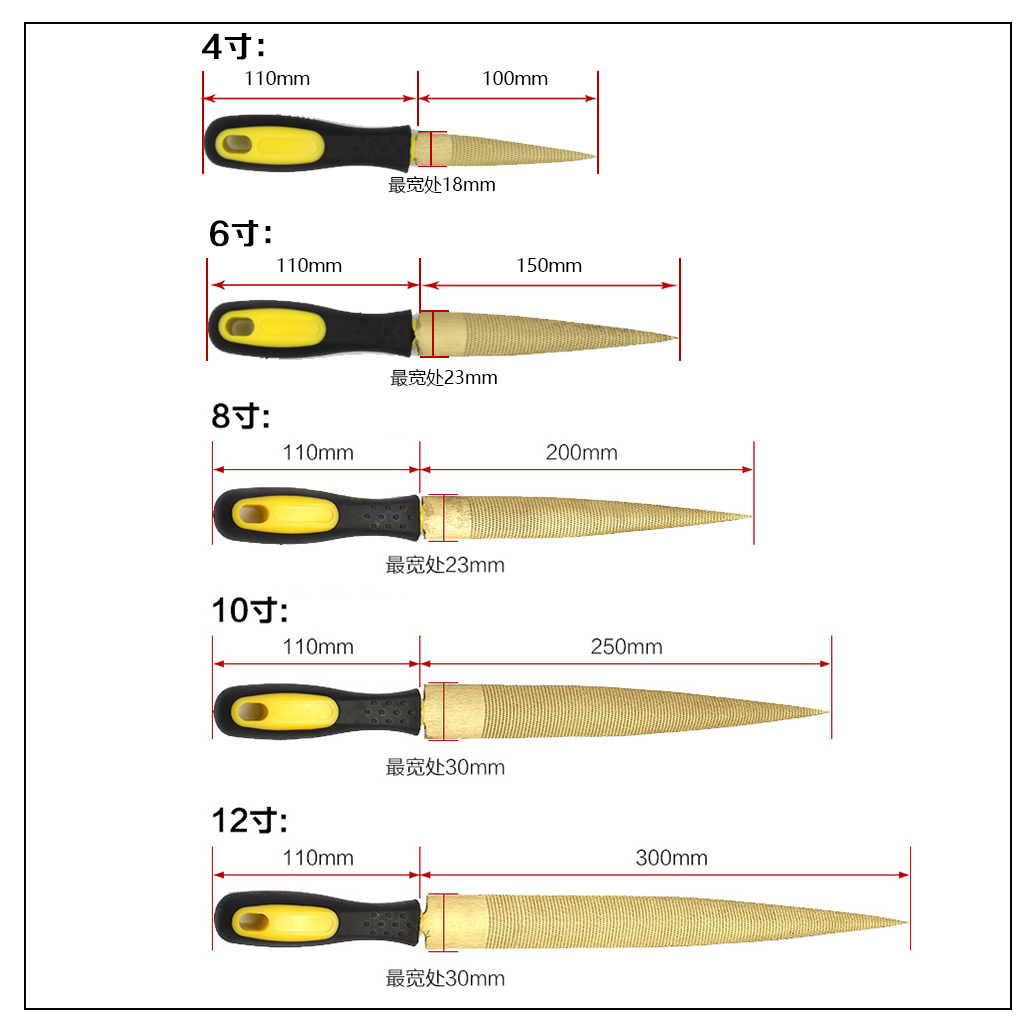 4 inch gold wood filing (pointed) 6 inch gold wood filing (pointed) 8 inch gold wood filing (pointed) 10 inch gold wood filing (pointed) 12 inch gold wood filing (pointed) Four-in-one steel wood filing 3 *