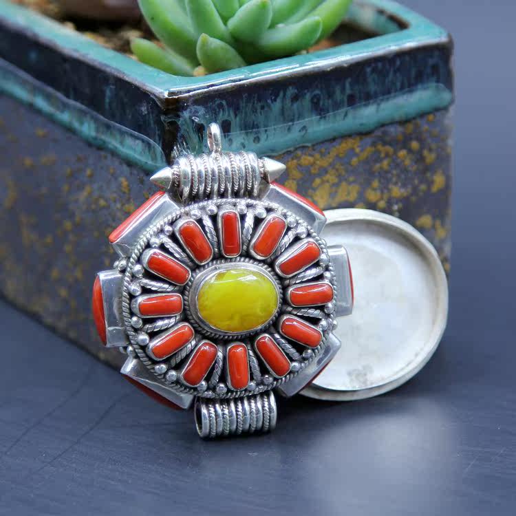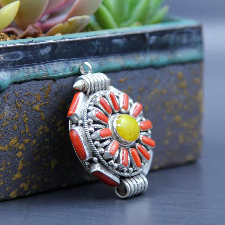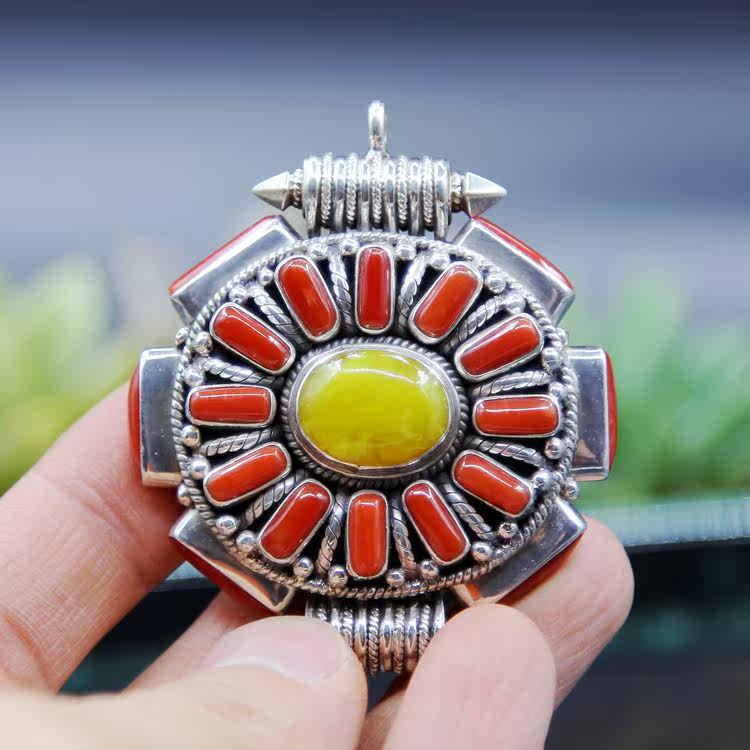 Nepal Pure Handmade Gau Box Necklace Pendant Pendant Kau Pure Silver Inlaid Original Branches Sea Redstone -A1