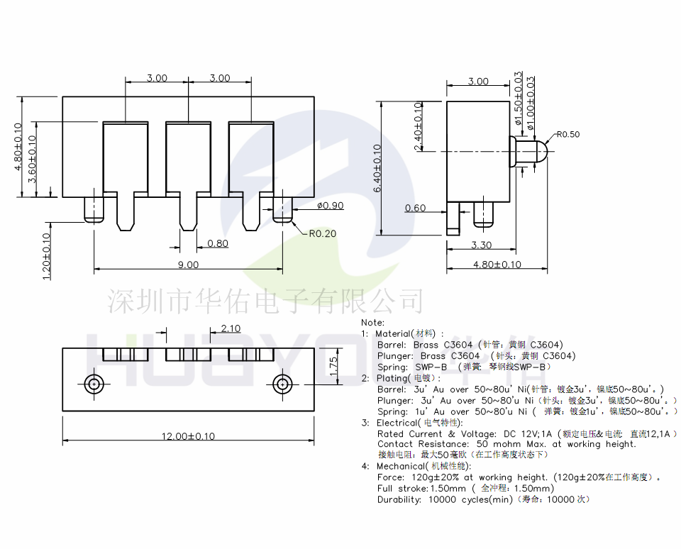 pogopinl connector Gold plated spring charging pin 3P-3 0 battery pin connector mold test