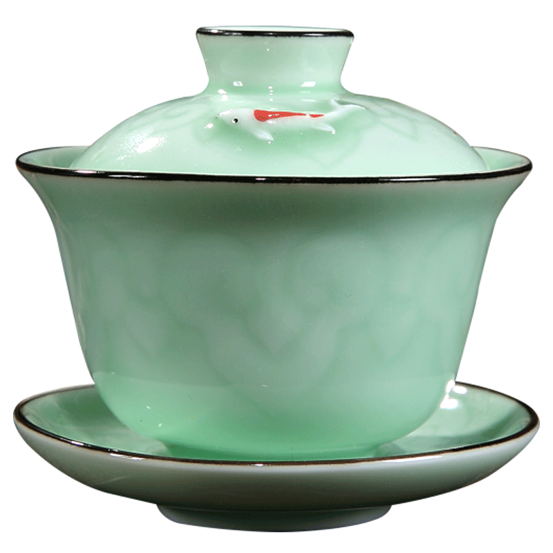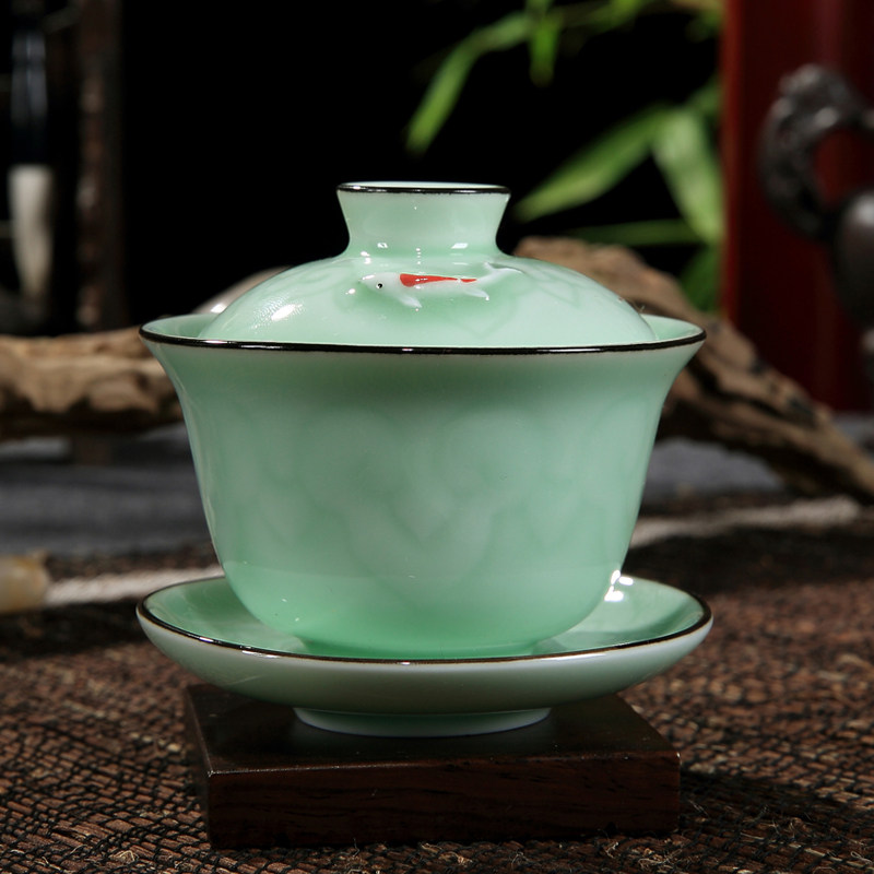 Ruyi pattern single fish cover bowl Ruyi pattern single fish tea set 9 pieces celadon-double fish cover bowl solid color celadon cover bowl