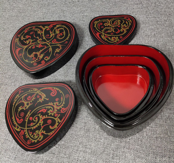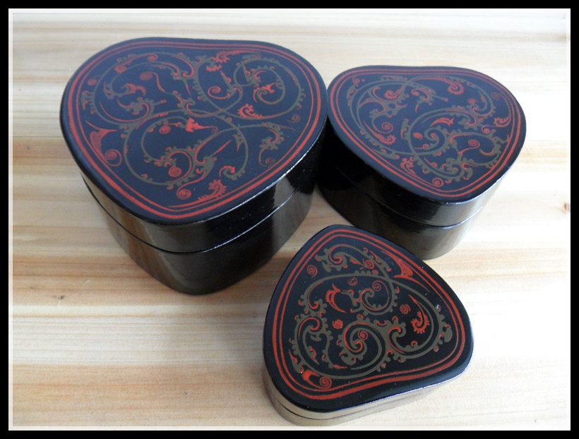 Wooden tire peach-shaped three-set box Heart-shaped box Antique lacquerware Knot box Wedding Chinese wedding lacquerware