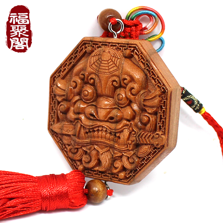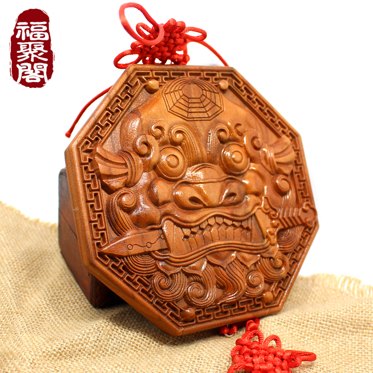 Peach Wood Beast Head Eight Divination Mirror Pendant Lion Bite Sword tiger head Town mansion Wooden Sculptures Feng Shui Defends Toilet Makeup room For door