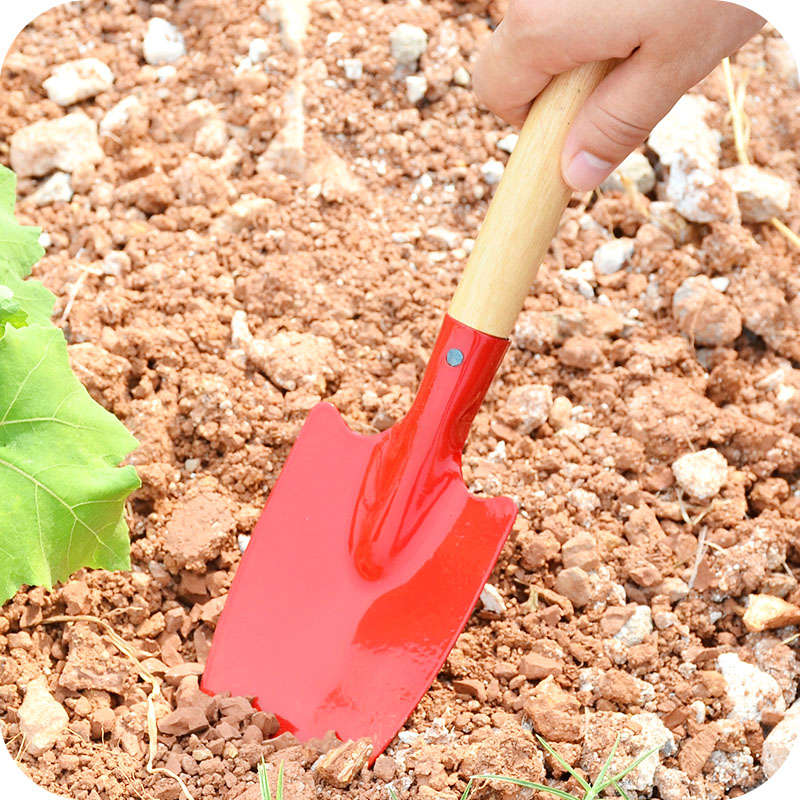 The wood shades the flower shovel with an iron handle.