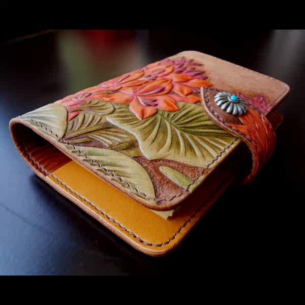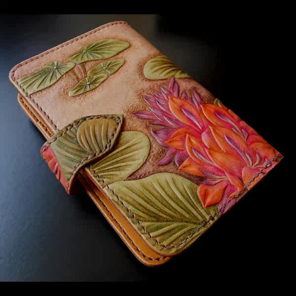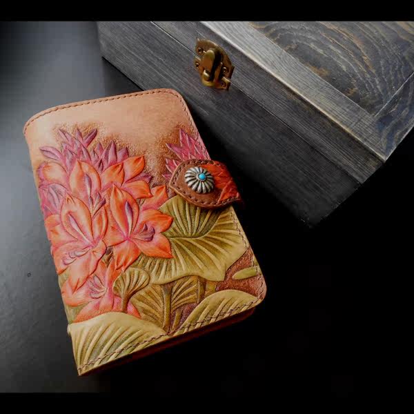 Handmade leather high - end gift male bag female bag tailored cow fur carving painting water floating lotus A7 notebook