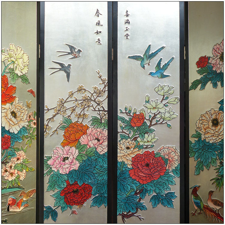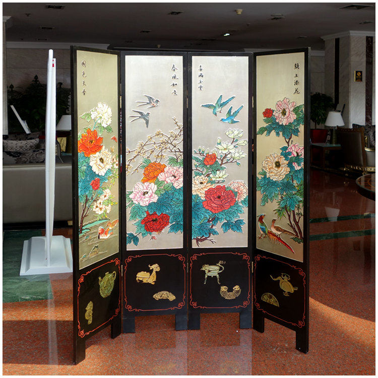Yangzhou Lacquer Engraving Lacquer Rich Peony Four Fold Screen Xuanguan Partition Customize New Vintage Lacquer Art Family Residence Decoration