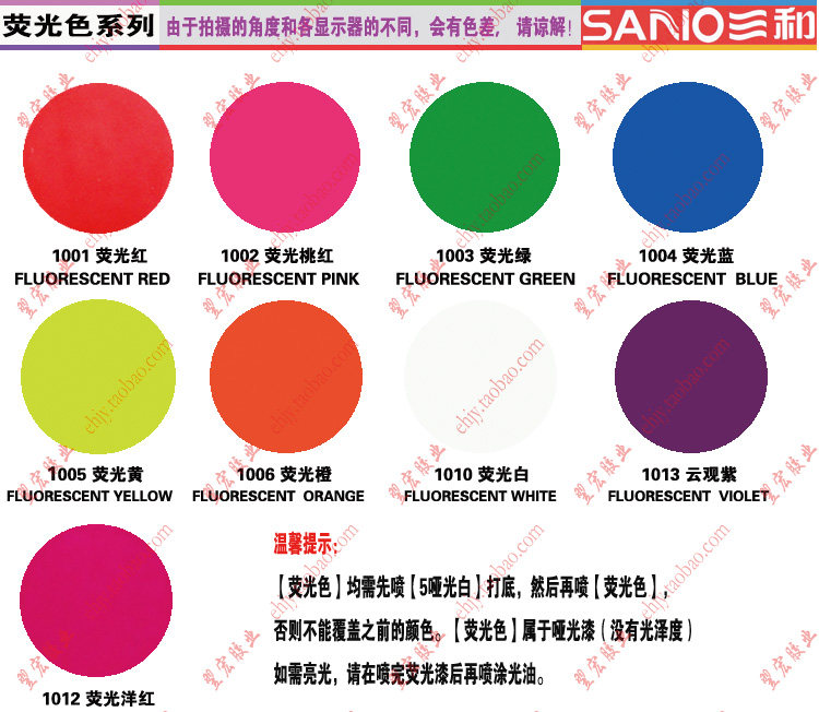 Red tangerine red green rose red 5 matt white (beat bottom) 190 light oil (protective color paint increased light) 1012 fluorescent magenta 1010 fluorescent white 1002 fluorescent peach red 10
