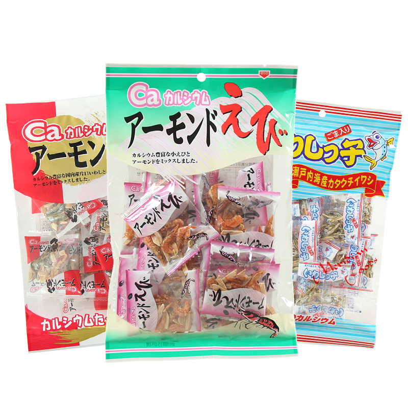 Sardine dried fish 37g (15 bags into)Almond dried fish 51g (16 bags into) Almond dried shrimp 48g(15 bags into)