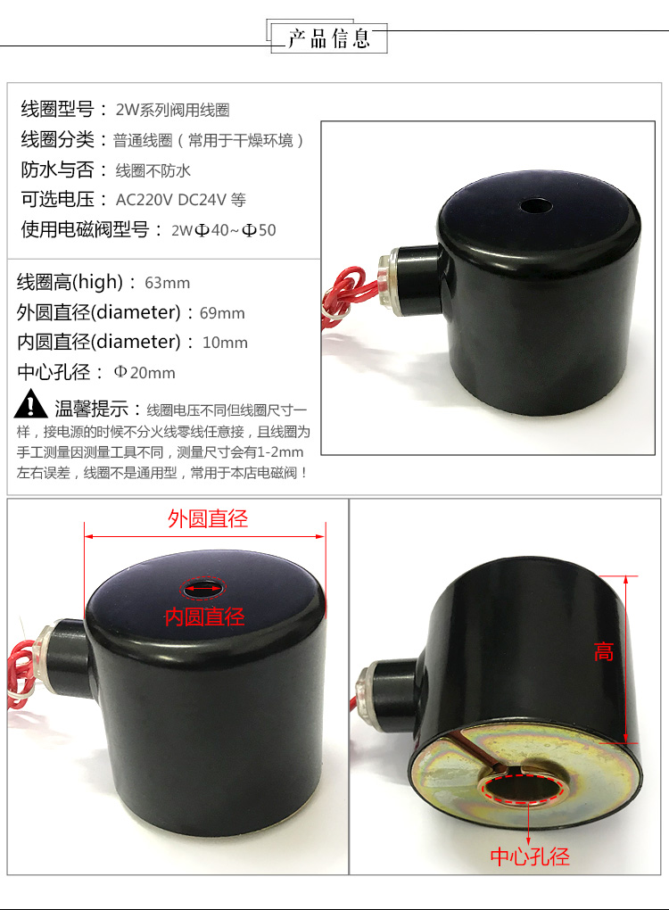 Solenoid valve coil AC220V DC24V Coil aperture: 20mm Large coil 2W series valve