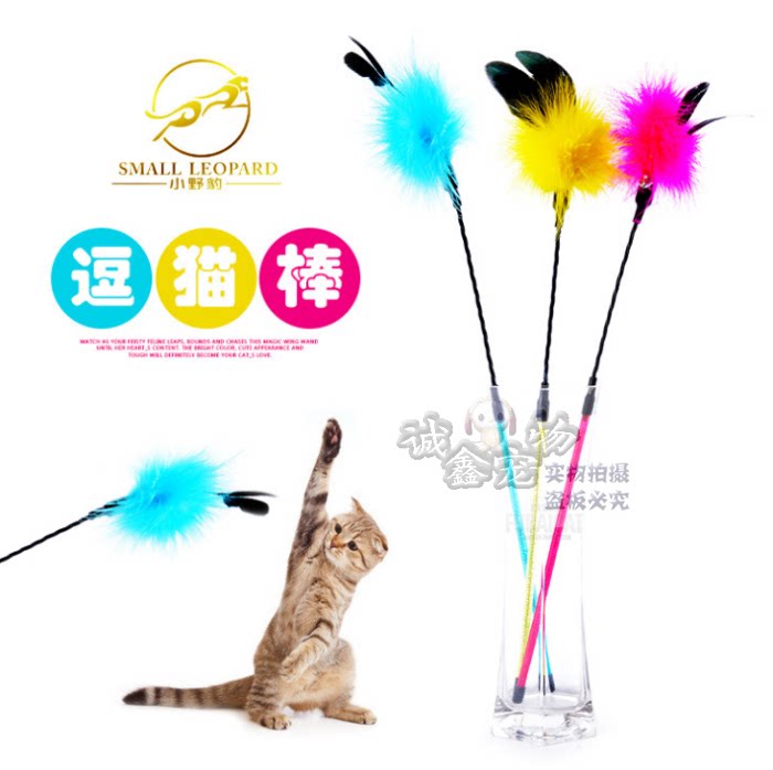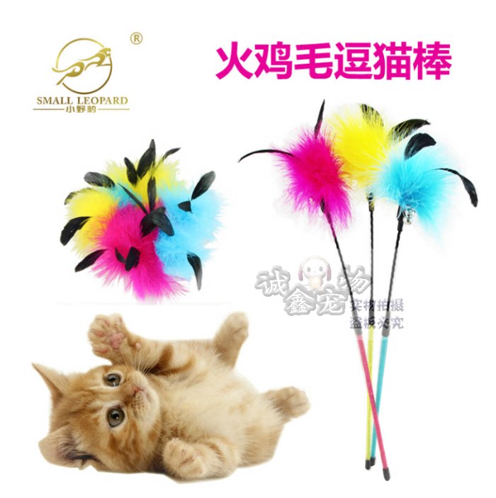 Little wild leopard kittens natural Fun with colorful turkeys fur teasing cat sticks Feather Sticks Teasing Cat Toys