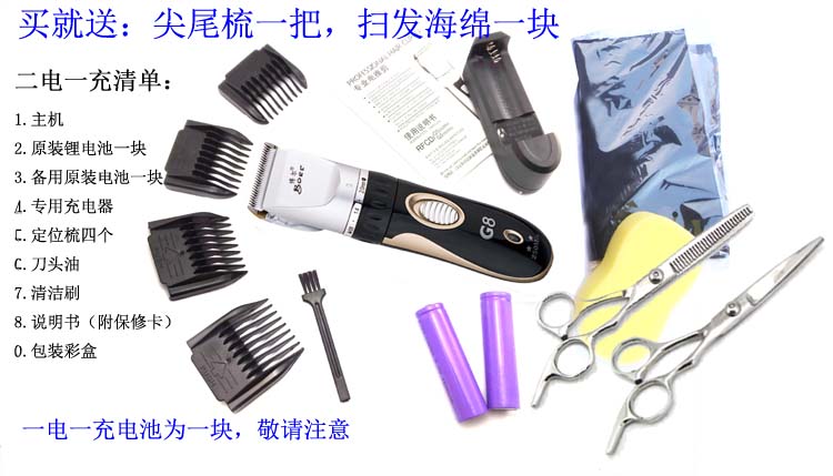 One charge and one charge, direct tooth scissors, spare blades, two charges, one charge, direct tooth scissors, spare blades, one charge, one charge, cloth, one charge, one charge, direct tooth scissors, spare blades, one charge, one charge, direct tooth scissors
