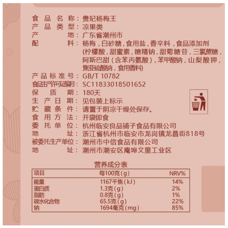 Yangmei, white sugar, edible salt, natural flavor, licorice food additive (citrate cyclamate, saccharin sodium, steviol glycoside, aspartame (containing phenylalanine), sodium benzoate, potassium sorbate)