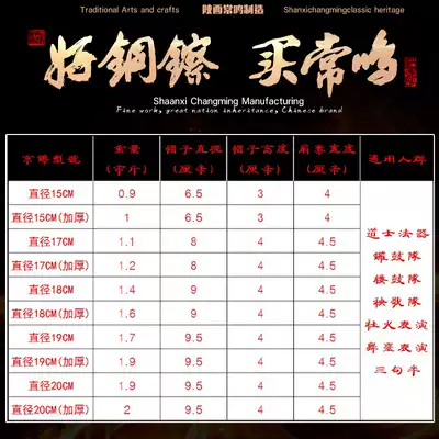 Xiaojing cymbals (about 15CM in diameter) Zhongjing cymbals (about 17CM in diameter) Zhongjing cymbals (about 18CM in diameter) Dajing cymbals (about 20CM in diameter) thickened small cymbals (about 15C in diameter)