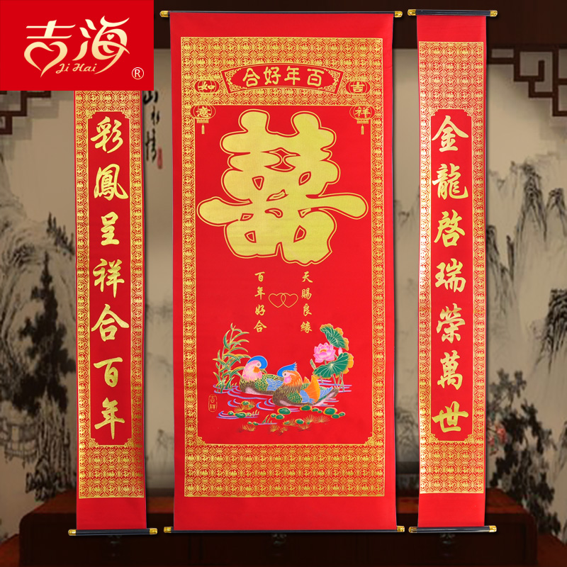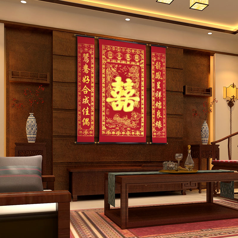 Wedding couplet in the hall painting flocking dragon and phoenix in the hall Wall hanging painting Xi Lian Chinese wedding wedding couplet gate