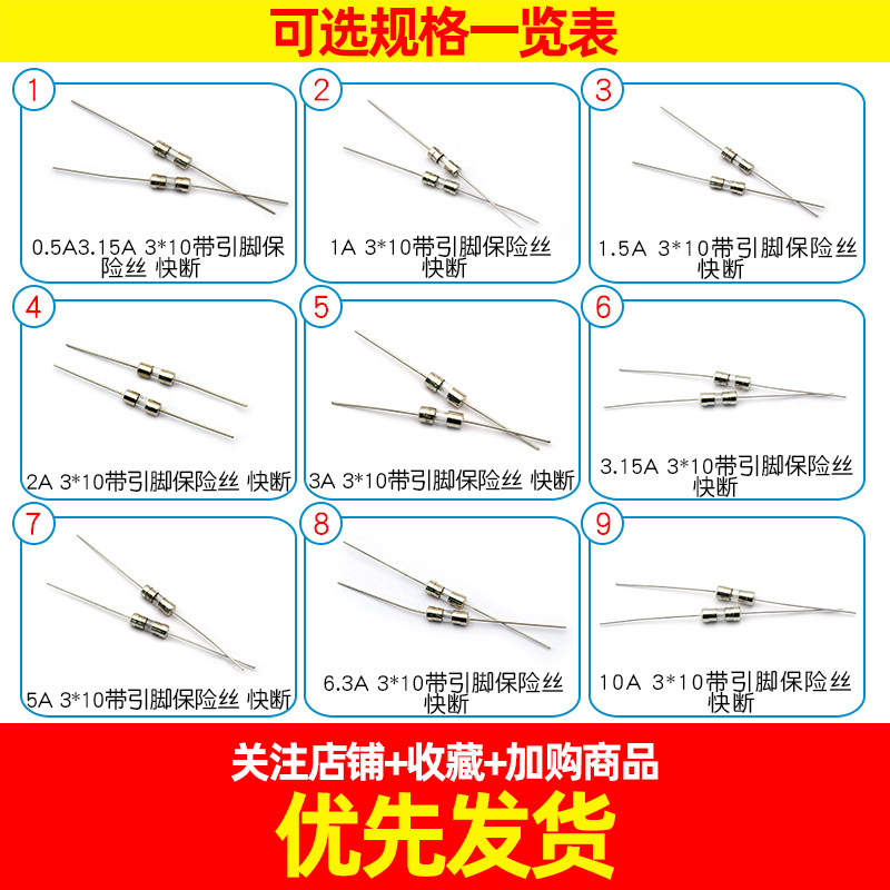 0.5A 3*10 Pinned Fuses Snap Break (20pcs) 1A 3*10 Pinned Fuses Snap-Off (20pcs) 1.5A 3*10 Pinned Fuses Snap-Off (20pcs) 2A 3*10 Pinned Fuses Snap-Off (20pcs) 3A 3*10 Pin-Led Fuses Snap-Off (20pcs) 3.15A 3*10 Pinned Fuses Snap-Off (20pcs) 5A 3*10 Pin-Led Fuses Snap-Off (20pcs) 6.3A 3*10 Pin-Led Fuses Snap-Off (20pcs) 10A 3* 10 Pinned Fuses Quick Break (20pcs) T0.5A 3.6*10 Pinned Fuses Slow Break (20pcs) T1A 3.6*10 Pined Fuses Slow Break (20pcs) T4A 3.6*10 Pined Fuses Slow Break (20pcs) T5A 3.6*10 Pinned Fuses Slow Break (20pcs) T6.3A 3.6*10 Pinned Fuses Slow Breaker (20pcs) T8A 3.6*10 Pined Fuses Slow Break (20pcs) T15A 3.6* 10 pinned fuses slow break (20 pcs)