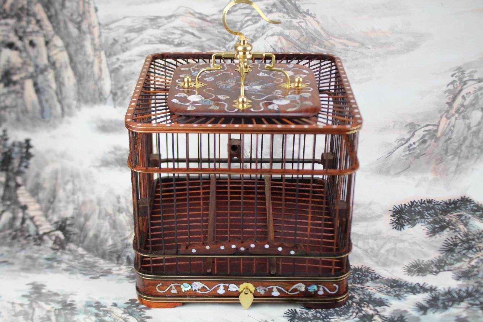 Export screw mahogany square bird cage inlaid with color shell red shell embroidered eye bird cage red acid branch purple sandalwood bird cage