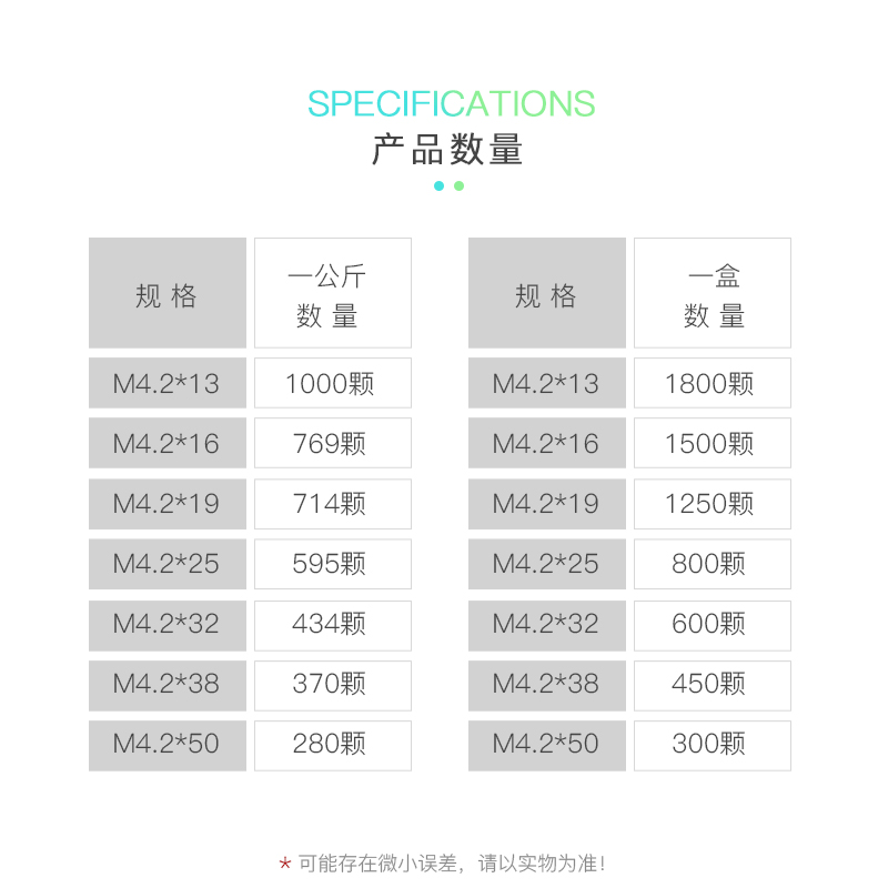 M4 2*13 A kilogram(about 1250 pcs)M4 2*16 A kilogram(about 800 pcs)M4 2*19 A kilogram(about 690 pcs)M4 2*25 A kilogram (about 1250 pcs) M4 2 * 16 A kilogram (about 800 pcs) M4 2 * 19 A kilogram (about 690 pcs) M4 2 * 25 A kilogram (about