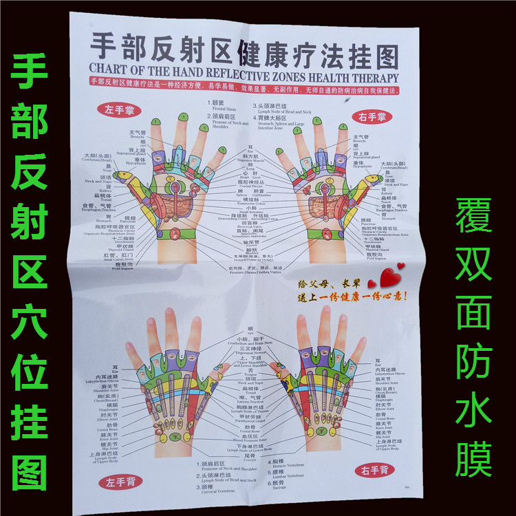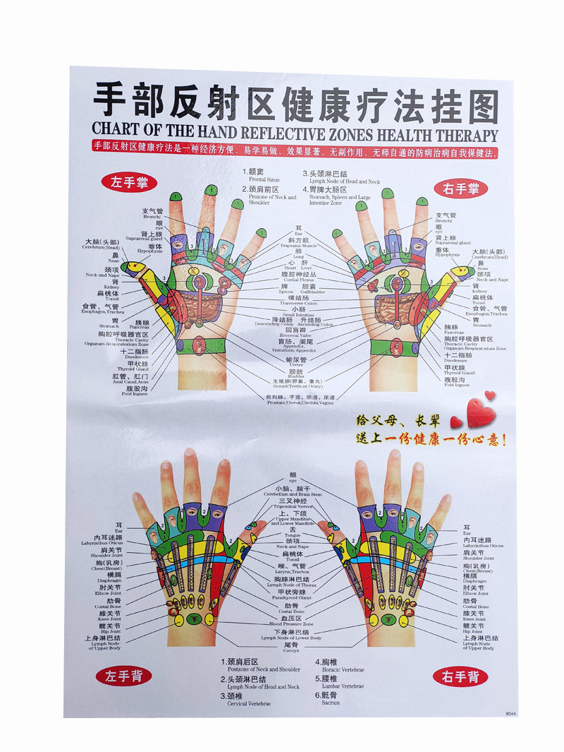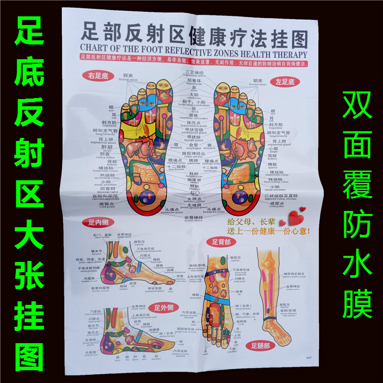 7 acupoint maps of hands, feet, ears, head, whole body, front, back, side, sole, and sole reflex zone of TCM human body meridian wall chart