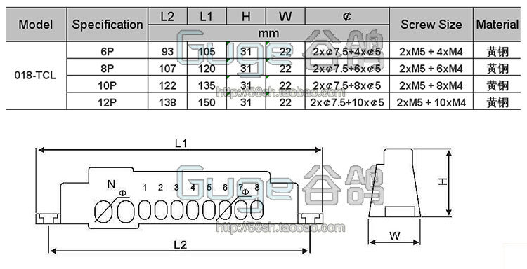 Distribution box with high current 8-hole zero-line terminal ground wire copper terminal distribution box zero-ground row wiring row TCL type