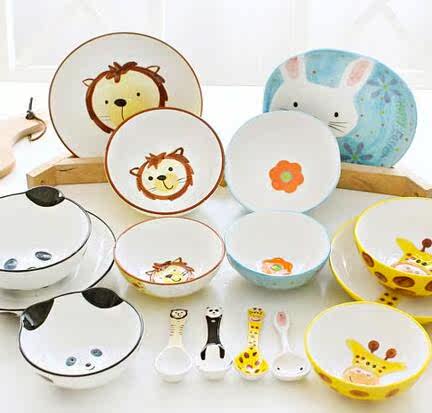 Rabbit four pieces (bowls spoon pasta dish) Elephants Four pieces (bowls spoons face bowls tray) small yellow duck four pieces (bowls spoonfuls face bowls pan) The lion's four pieces (bowls spoonfuls face bowls dish)