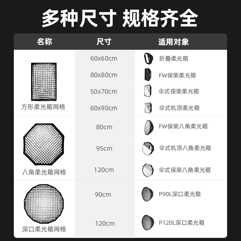40 * 40 grille (s type flexlight box for use) 50 * 50 grilles (s type soft light box for use) 60 * 60 grilles (s type flex-light box for use) 80 * 80 grilles (s type flexo light