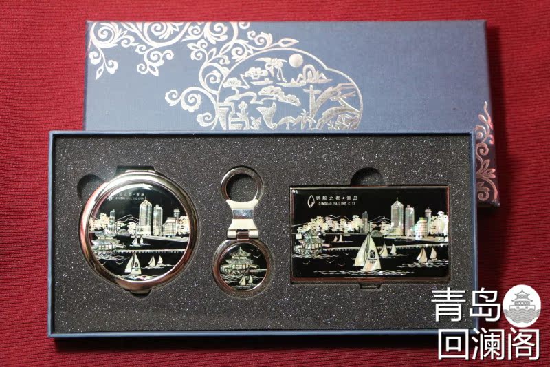 Qingdao characteristic commemorative gift shell-carved mother-of-pearl business card case makeup mirror keychain three-piece suit business companion gift