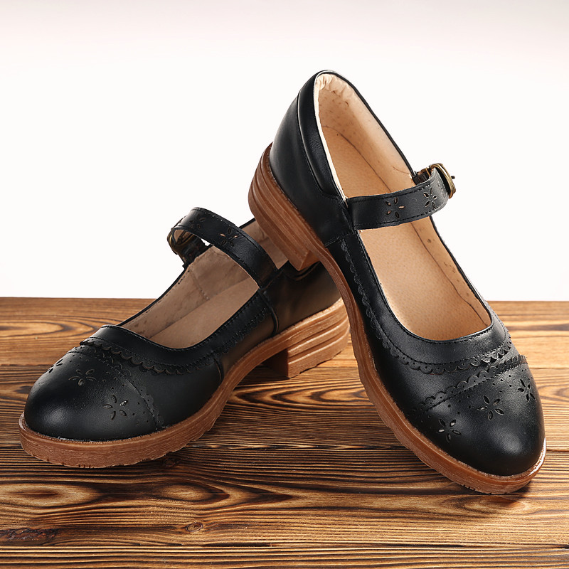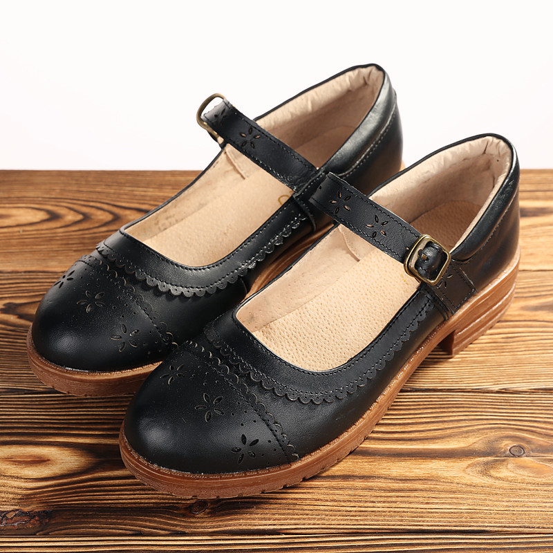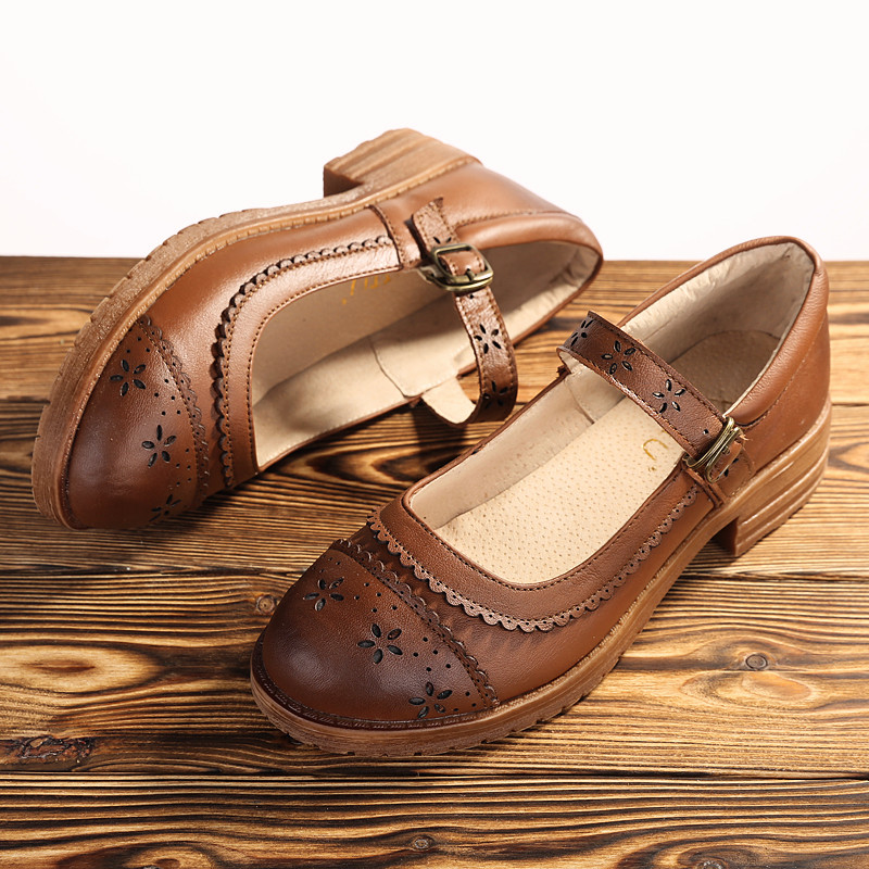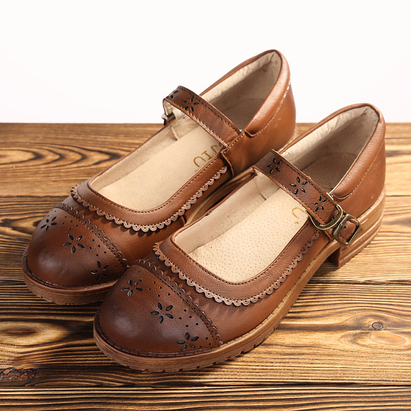 Recalling the old Mary Jane Japanese flat-bottomed women's shoes literary leather bag shoes cotton and linen retro carved leather shallow mouth women's shoes