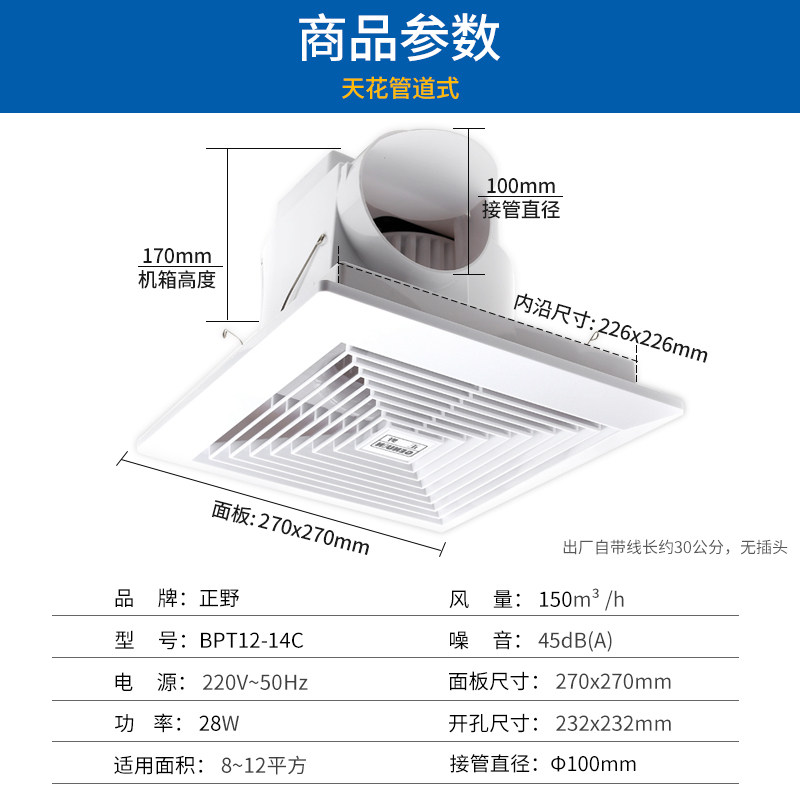 Zhengye exhaust fan BPT12-14C ceiling ceiling pipe kitchen bathroom ventilation fan 10 inch strong static