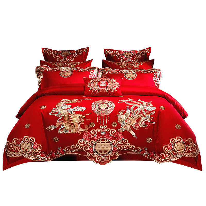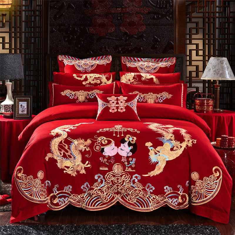 New Wedding Celebration Four Sets Large Red All-cotton Embroidery Longfeng Wedding House Courtesy of the Wedding Pure Cotton Six Sets of Quilt Bedding bedding