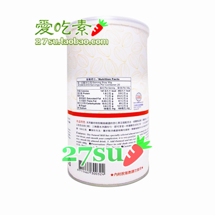 Taiwan NATURAL MILL LILY ALMOND TEA (POWDER)600G CANS Vegan Plant Milk Meal Replacement