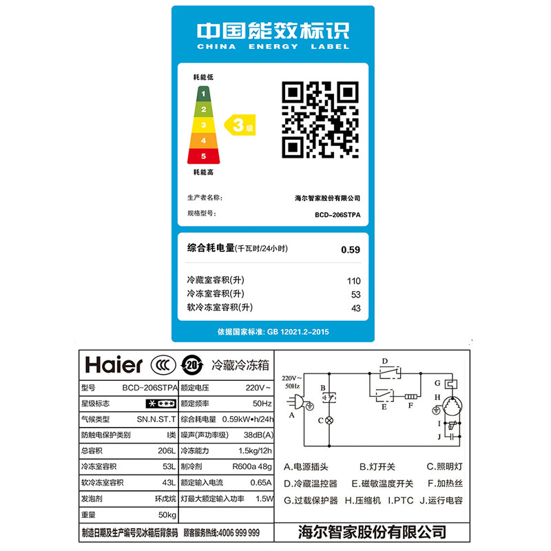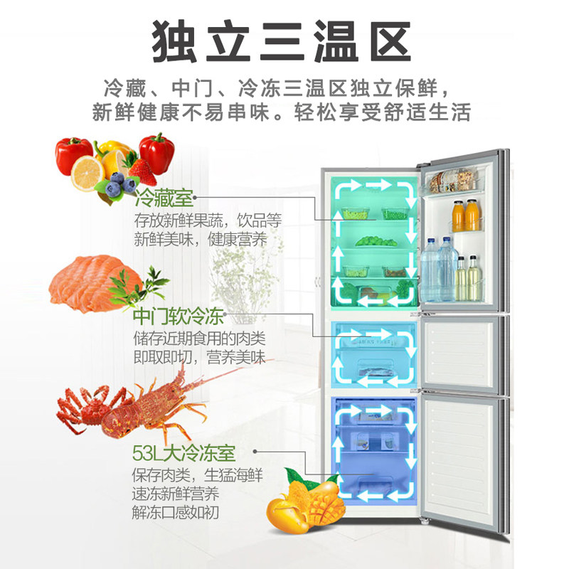 Haier 206L direct-cooling refrigerator three-door rental dormitory household three-door energy-saving mini small refrigerator