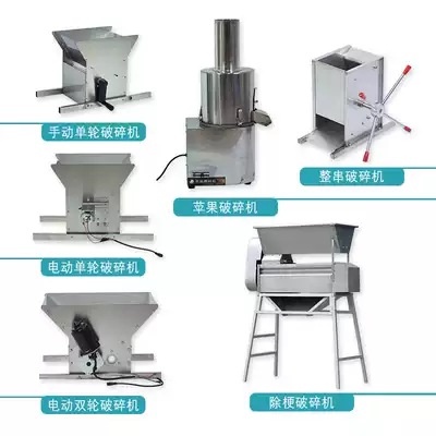 Two-wheeled electric crusher Stem removal crusher (electric)Single-wheeled manual crusher Single-wheeled electric crusher Whole string crusher Apple crusher