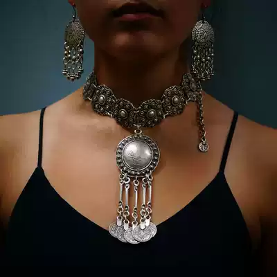 Bohemian retro ethnic minority style necklace earrings set Tassel coin clavicle chain Accessories Female