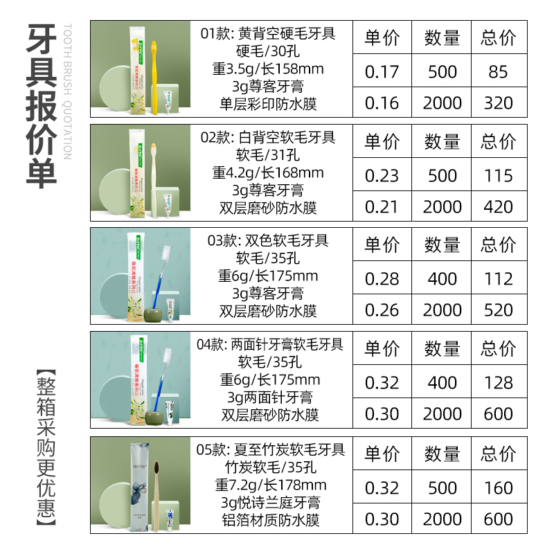 (20 sets) Home Hospitality Travel Special (100 pieces) Yellow Back Empty Hard Wool Single Toothbrush (100 sets) Yellow Back Empty Hard Wool Tooth Appliance (100 sets) White Back Empty Soft Wool Tooth Dental Appliance (100 sets) Two-color Soft Wool Tooth Dental Appliance (100 sets) Two-sided Needle Toothpaste Soft Hair Dental Appliance (100 sets) Summer Solstice Bamboo Charcoal Soft Wool Toothware (100 sets) Kraft Paper Korean Version Soft Wool Toothware (100 sets) Kraft Paper Non-slip Soft Wool Toothware (100 sets) Soft Film Straw Toothware (100 sets) Allure Soft Film Chinese Style Dental Appliance (100 sets) Soft blue straw soft wool dental appliances (500 sets) Yellow back empty hard wool teethers (500 sets) White back empty soft hair dental appliances (400 sets) Two-color soft wool teethers (400 sets) Two-sided needle toothpaste soft hair dental appliances (500 sets) Summer solstice bamboo charcoal soft wool teethers (400 sets) Kraft paper Korean version soft wool teethers (500 sets) Kraft paper anti-slip soft wool toothware (400 sets) Light holding soft film straw dental appliances (500 sets) Allure soft film Chinese style dental appliances (400 sets) Soft blue straw soft wool teeth (2000 sets of whole box) Yellow back empty hard wool teethers ( 400 sets) Yellow back empty hard wool teeth ( Whole box 2000 sets) white back empty soft wool dental appliances (2000 sets of whole box) two-color soft wool dental appliances (whole box 2000) two-sided needle toothpaste soft hair dental appliances (whole box 2000 sets) summer solstice bamboo charcoal soft wool teeth (whole box 2000) kraft paper Korean version soft wool teeth (whole box 2000) kraft paper anti-slip soft wool teeth (whole box 2000 sets) light soft film straw teething utensils (whole box 2000) Allure soft film Chinese style dental appliances (whole box 2000 sets) soft blue straw soft wool teethers guest custom logo appreciation