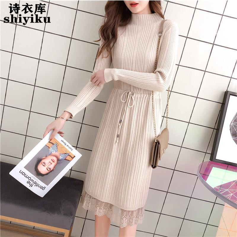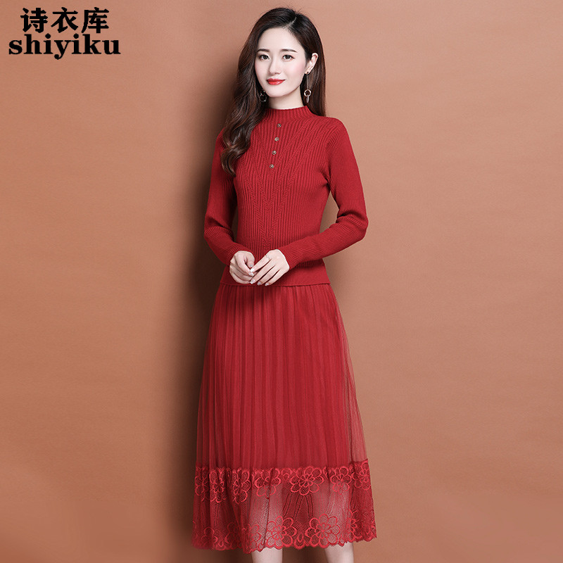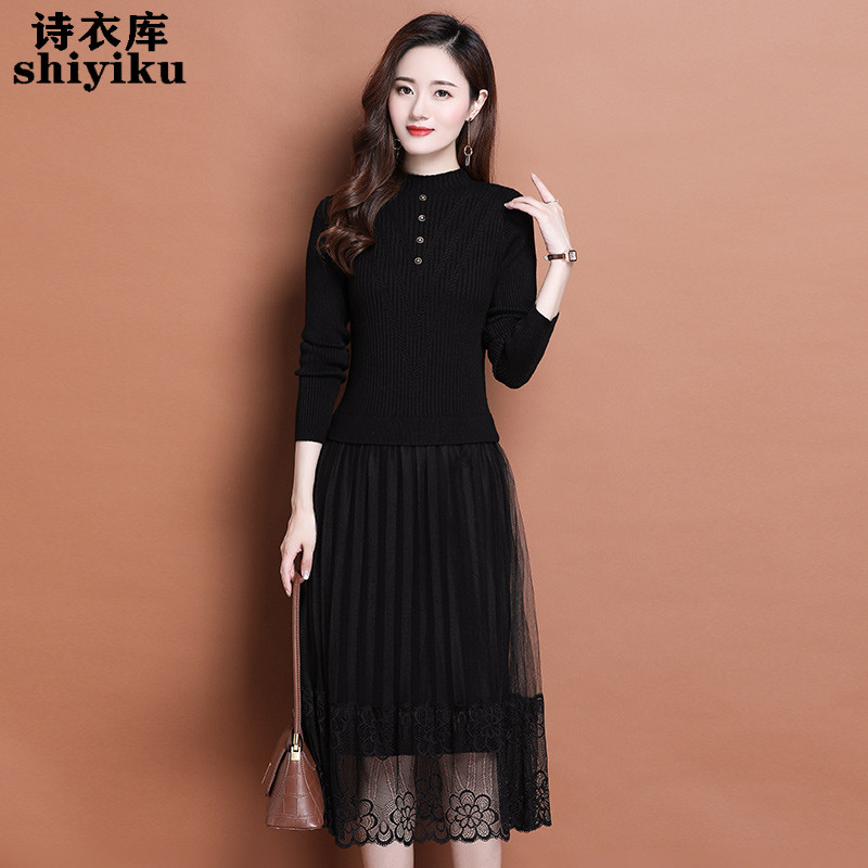 Dress women 2020 spring and autumn long-sleeved over-the-knee mid-length stitching lace skirt knitted fake two-piece autumn and winter sweater skirt
