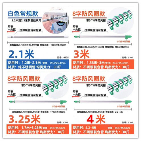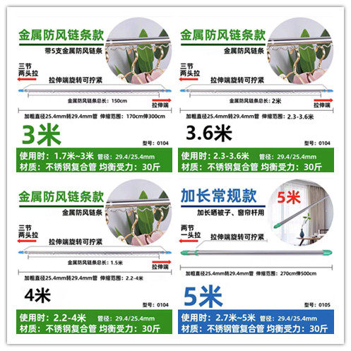 Thickened two sections of telescopic 1.2-2.1 m (1 stick) thickened two sections of telescopic 1.58-3 meters (1 stick) thickened two sections of telescopic 1.7-3.25 meters (1 stick) thickened two sections of telescopic 2.2-4 meters (1 stick) thickened two sections of stretching 2.7-5 meters (1 piece) thickened three sections of 1.7-3 meters with windproof chain (1 piece) thickened three sections of 2.3-3.6 windproof chain (1 piece) Stainless steel telescopic jacket fork stainless steel large quilt clamp (5 pieces) stainless steel pendant (one pair) stainless steel flange seat (one pair)