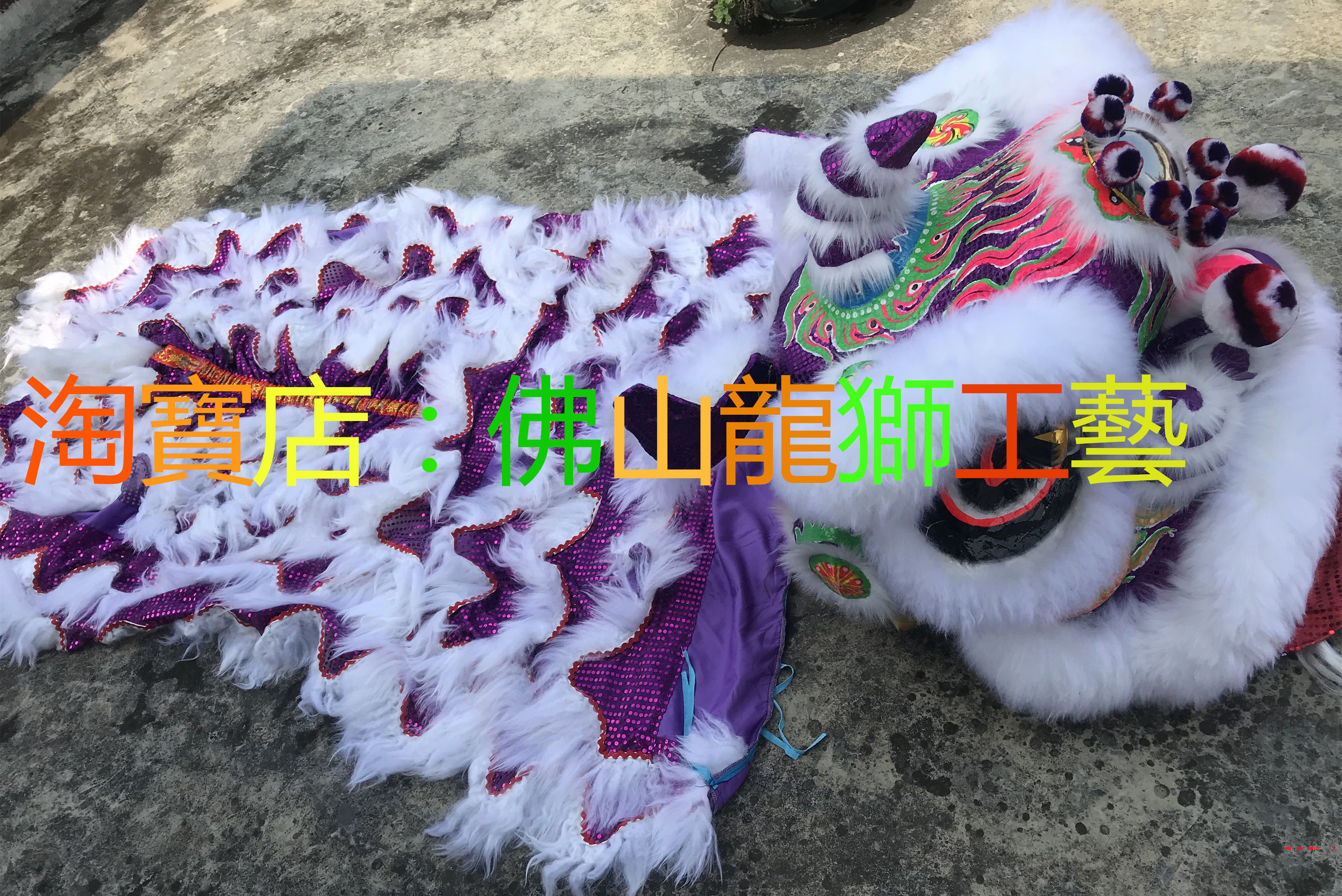Authentic Foshan traditional Buddha dress (round gills, purple bead pieces, white wool lion head set) bead piece cloth) South wake lion) set