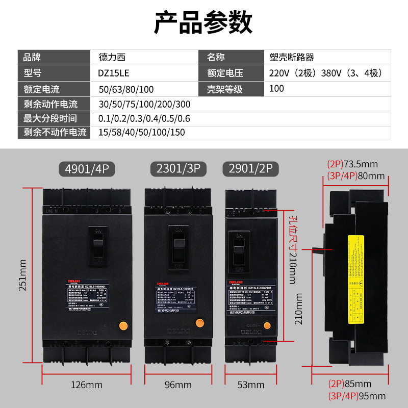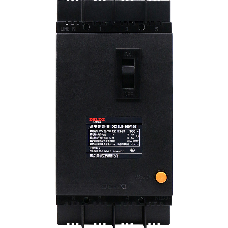 Delixi plastic shell leakage circuit breaker DZ15LE three-phase four-wire 100A air-open single-phase 220V protector switch
