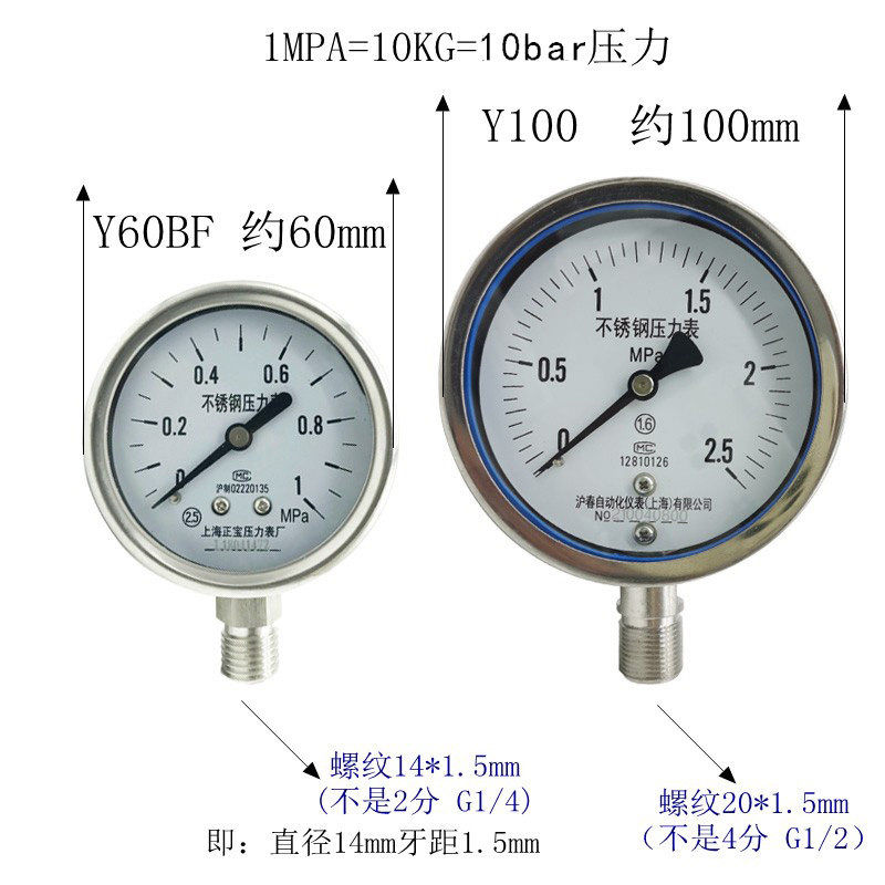 304 all stainless steel pressure gauge Y60BF anti-corrosion and anti-rust Y100BF water pressure gauge barometer high temperature gauge steam gauge