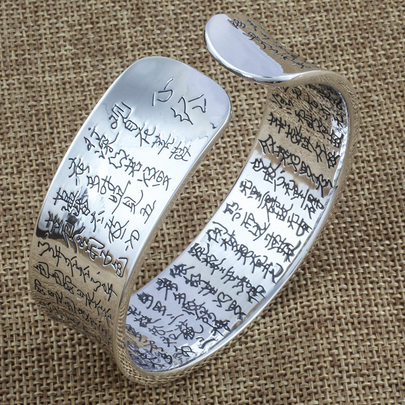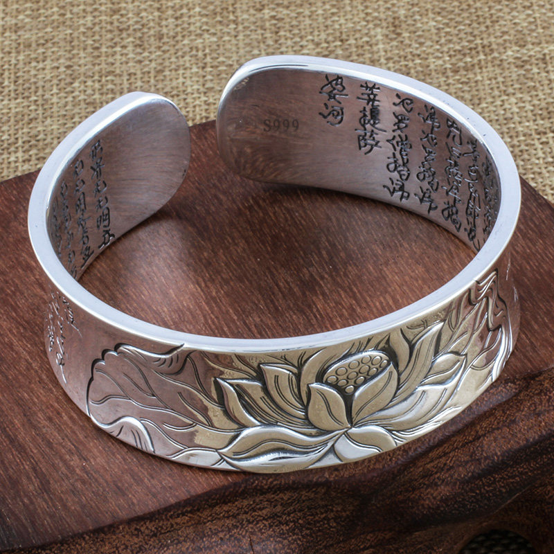 Jiuxi silver building S999 foot silver opening pure silver wide version bracelet lotus heart warp retro silver bracelet male and female silver ornament