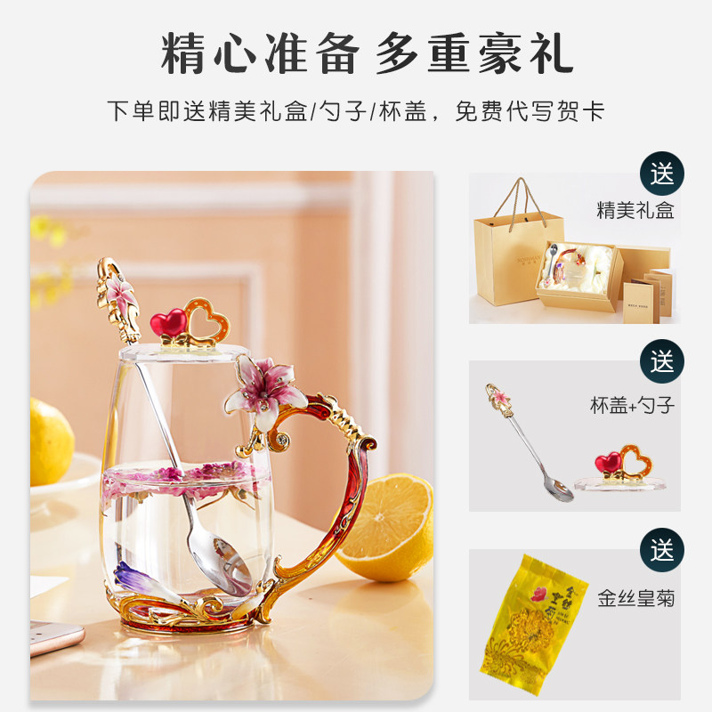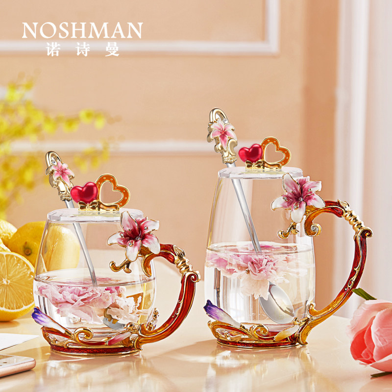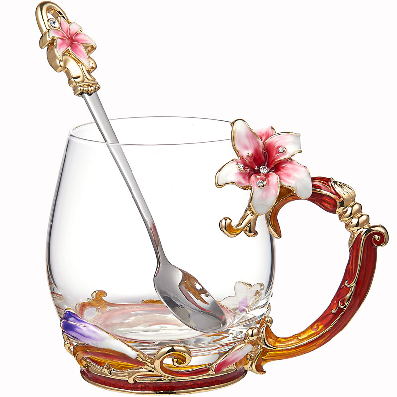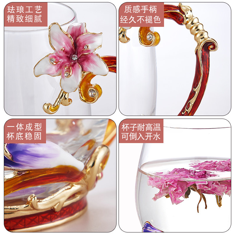 Carved Flower Enamel Color Crystal Glass Cup Water Cup Women's Office Flowers Tea Cup Home Tea Cup Suit Beautiful Mug